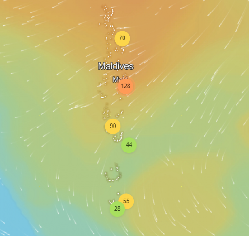 ވައިގެ ސާފު މިންވަރު ދައްކައިދޭ އައިކިއު އެއާއިން ދައްކާ ގޮތުގައި، މާލެގައި ޔޫއެސް އައިކިއު ހުރީ، 108ގައެވެ. އެއީ، ނުރައްކަލުގެ އޮރެންޖު ސަމާލު ކަމަށްވާއިރު، ވިލިމާލޭގައި އެ އަދަދު ހުރީ، 151 ގައެވެ. އެއީ، ނުރައްކަލުގެ ރަތް ސަމާލެވެ.