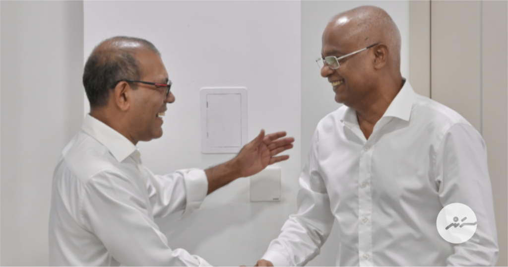 ކުރީގެ ރައީސް ޞާލީޙާއި ކުރީގެ ރައީސް ނަޝީދު: ދެ ބޭފުޅުން ސުލްހަވުމަށް ޓަކައި ވަނީ ބައްދަލުކުރައްވައިފައި -- ފޮޓޯ/ އެމްޑީޕީ