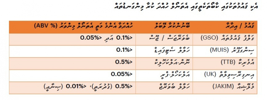 މަސްދަރު: GSO 2538:2021، MUIS 2025، US TTB، UK DHSC (2023) އަދި Pauzi et al. (2019) ގެ ރަސްމީ މިންގަނޑުތައް.