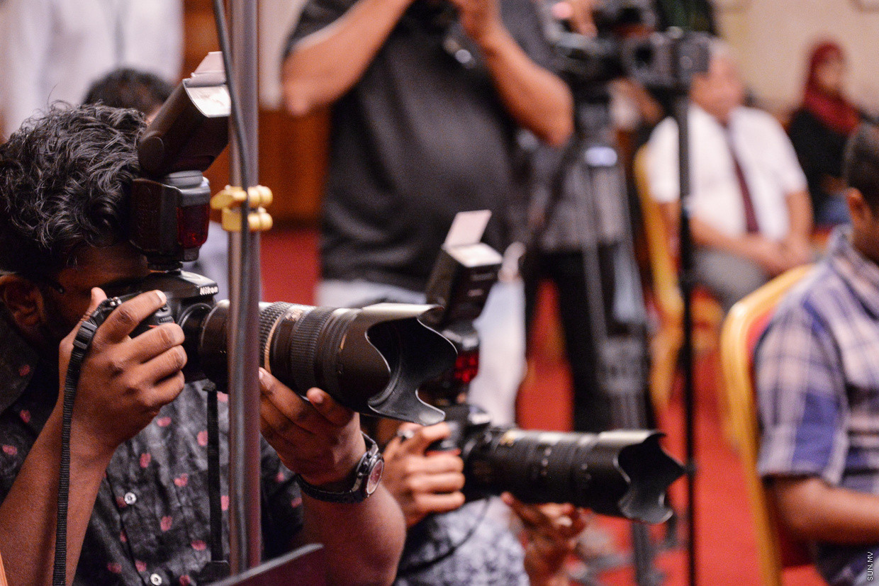 ޕްރެސް ކޮންފަރެންސްގައި ނޫސްވެރިންތަކެއް: އަމިއްލަ މީޑިއާތަކަށް ފައިސާ ދޭން ނިންމުން ފާޑުކިޔަން ވަނީ ފަށާފައި -- ސަން ފޮޓޯ/ ފަޔާޒު މޫސާ
