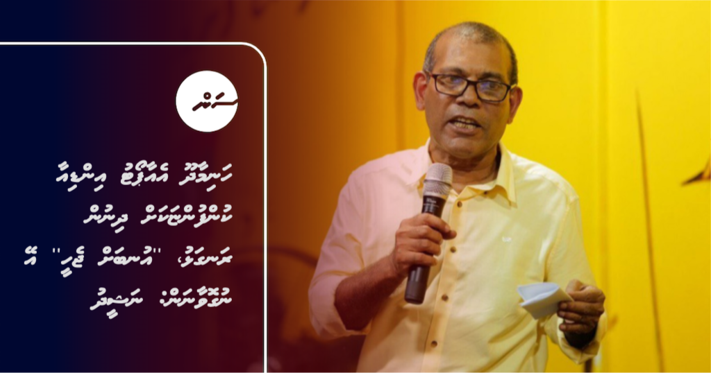 އެ ތަނުގެ ލޯނު ރައްޔިތުންގެ ޖީއެސްޓީ ފައިސާއިން ދައްކަން ދެން "އަތްޖަހަން" ތިބެންވީތޯ ނަޝީދު ސުވާލު އުފެއްދެވިއެވެ. އަދި، ބޭނުންވަނީ، މިހާރަށް ވުރެ އާންމު ހާލަތު ރަނގަޅުވެ، ރައްޔިތުންނަށް ތަނަވަސް ދިރިއުޅުމެއް އުޅެވޭނެ ގޮތެއް ހޯދަން ކަމަށް ވިދާޅުވިއެވެ.