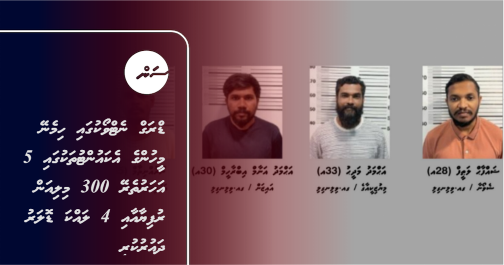 ފުޅާ ދާއިރާއެއްގައި މަސްތުވާތަކެތީގެ ވިޔަފާރި ހިންގަމުން އަންނަ ފަރާތްތައް ހޯދުމަށްޓަކައި ފުލުހުން "އަލިމަގު"ގެ ނަމުގައި ފެށި އޮޕަރޭޝަނުގައި މާލެއާއި ގއ. އަތޮޅުން މިދިޔަ އާދިއްތަ ދުވަހު ހައްޔަރުކުރި ހަތަރު މީހުންގެ ބޭންކު އެކައުންޓުތަކުގައި މިދިޔަ ފަސް އަހަރުތެރޭ 300 މިލިއަން ރުފިޔާއާއި ހަތަރު ލައްކަ ޑޮލަރު ދައުރުކުރި ކަމަށް ފުލުހުން މިރޭ ބުނެފިއެވެ.