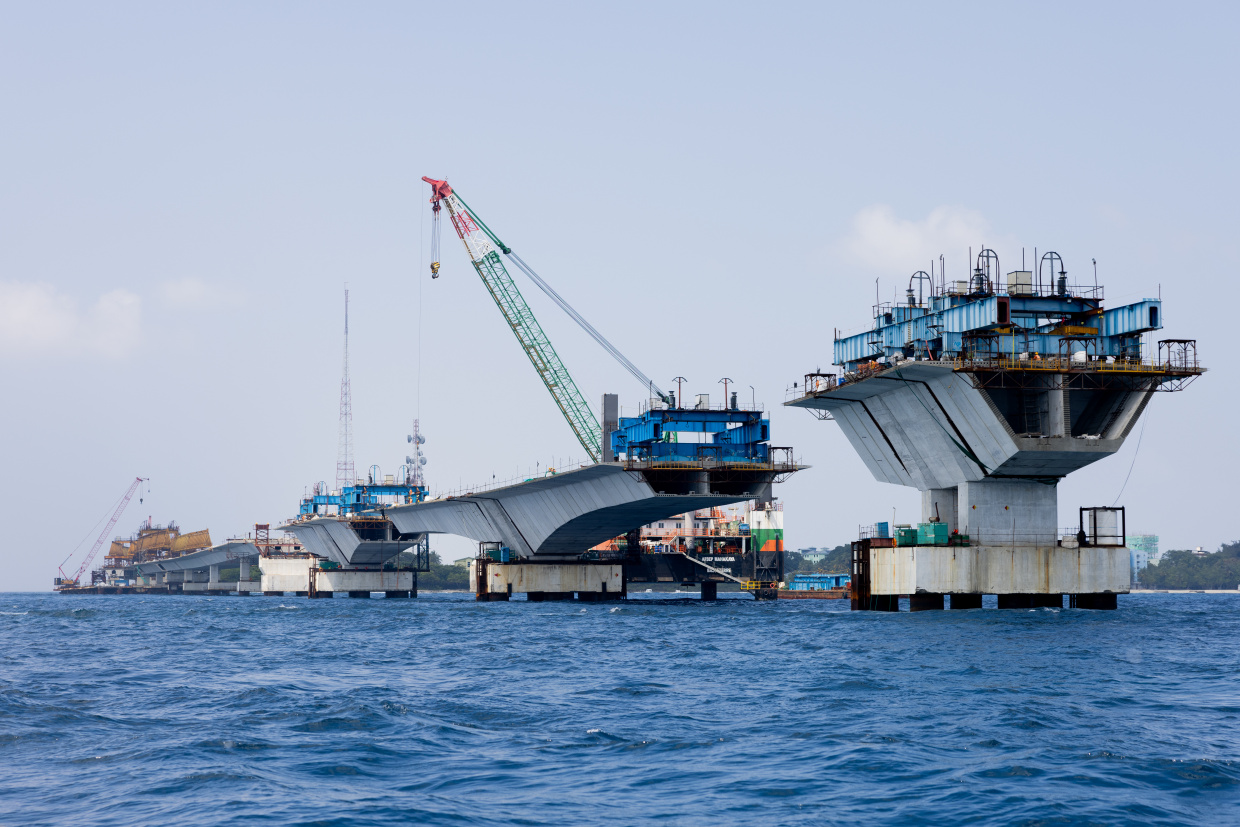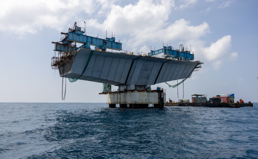 ތިލަމާލެ ބްރިޖުގެ މަސައްކަތަށް ސެގްމަންޓުތައް ގުޅުވުމުގެ މަސައްކަތް ކުރަނީ -- ސަން ފޮޓޯ: މުޙައްމަދު ޝާން