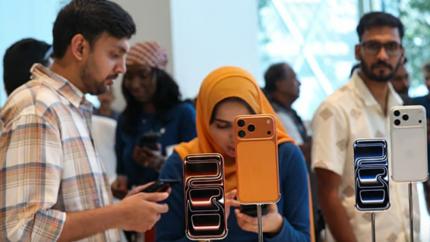 ޒުވާނުންތަކެއް އެންމެފަހުން ބާޒާރަށް ނެރުނު އައިފޯންތަކެއް ފިހާރައެއްގެތެރޭ ބަލާލަނީ--ފޮޓޯ/ގަލްފްނިއުސް