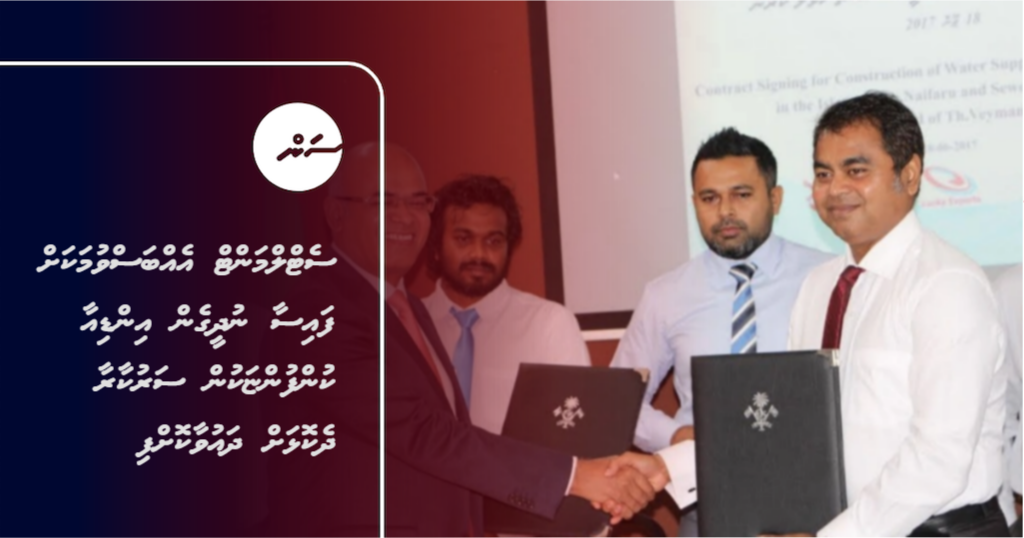 ޅ. ނައިފަރުގައި ފެނާއި ނަރުދަމާ އަދި ތ. ވޭމަންޑޫގައި ނަރުދަމާގެ މަސައްކަތް ކުރަން އިންޑިއާގެ ޖޮއިންޓް ވެންޗާ ކުންފުންޏެއް ކަމަށްވާ އެލްއީ ޓްރިވެނީ ޖޭވީއާ ހަވާލުކުރީ، 2017 ވަނަ އަހަރުގެ ޖޫން މަހުގެ 18 ވަނަ ދުވަހުއެވެ. އެ މަސައްކަތުގެ އެއްބަސްވުމުގައި ސަރުކާރުން ސޮއިކުރީ، އޭރުގެ އެންވަޔަރްމަންޓް މިނިސްޓަރު ތޯރިގް އިބްރާހިމް އަދި އެ ކުންފުނީގެ ޑިރެކްޓަރު ވިނޭ ކުމާރު ސިންގްއެވެ.