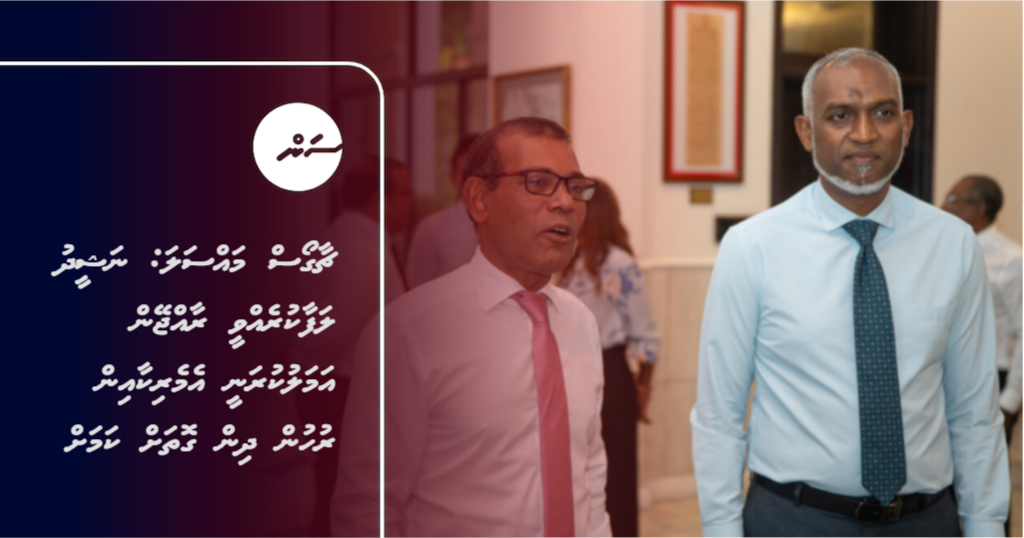 ރައީސް ޑރ. މުޙައްމަދު މުއިއްޒާއި ކުރީގެ ރައީސް މުޙައްމަދު ނަޝީދު: ދިވެހި ސިފައިން އަމަލުކުރީ އެމެރިކާގެ ރުހުމާއެކު ކަމަށް ވެދާނެ ކަމަށް ނަޝީދު ވިދާޅުވި -- ފޮޓޯ: މަޖިލިސް