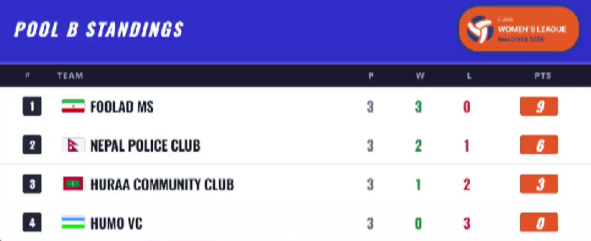 ކާވާ ވިމެންސް ލީގުގެ ޕޫލް ބީގައި ނޭޕާލް ޕޮލިސް ކުލަބު އަތުން ސީދާ ތިން ސެޓުން ބަލިވުމާއެކު ރާއްޖޭގެ ހުރާ ކޮމިއުނިޓީ ކުލަބަށް މުބާރާތް ނިމިއްޖެއެވެ.