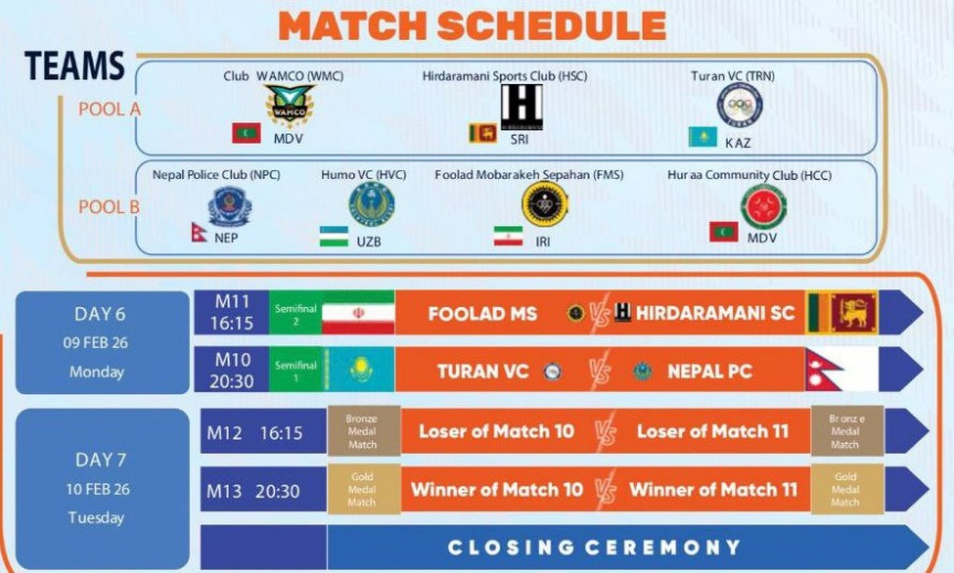 ސެމީ ފައިނަލުން ބަލިވާ ދެ ޓީމަށް ބްރޮންޒް މެޑަލް މެޗު ލިބޭއިރު، މުބާރާތުގެ ފައިނަލް މެޗު ކުޅުމަށް ތާވަލުކޮށްފައިވަނީ ފެބްރުއަރީ 10 ވަނަ ދުވަހުގެރޭ 20:30 ގައެވެ.