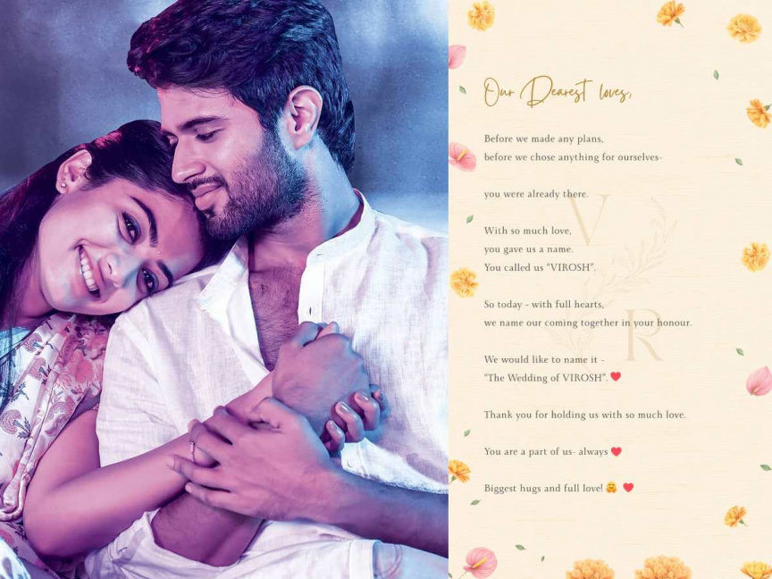 ސަޕޯޓަރުންގެ ފަރާތުން ދެ ތަރިންގެ ގުޅުމަށް "ވިރޯޝް"ގެ ނަންދިނީ ވަރަށް ލޯތްބާއެކު ކަމަށާއި އެހެންވެ ވިޖޭ އާއި ރަޝްމިކާގެ ކައިވެނީގެ ރަސްމީ ނަމަކީ "ދަ ވެޑިންގް އޮފް ވިރޯޝް" ކަމަށް ބަތަލާ ވަނީ ބުނެފައެވެ.
