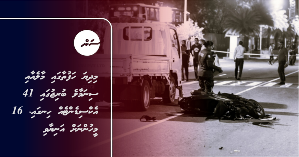 ފުލުހުން މިއަދު އާންމުކުރި ހިސާބުތަކުން އެނގޭ ގޮތުގައި، މިދިޔަ ހަފުތާގައި އެކަނި 41 އެކްސިޑެންޓު ވަނީ ހިނގާފައެވެ. މި އެކްސިޑެންޓުތަކުގައި 16 މީހުންނަށް އަނިޔާވެފައިވާއިރު، 51 ވެހިކަލަކަށް ވަނީ ގެއްލުންތައް ލިބިފައެވެ.