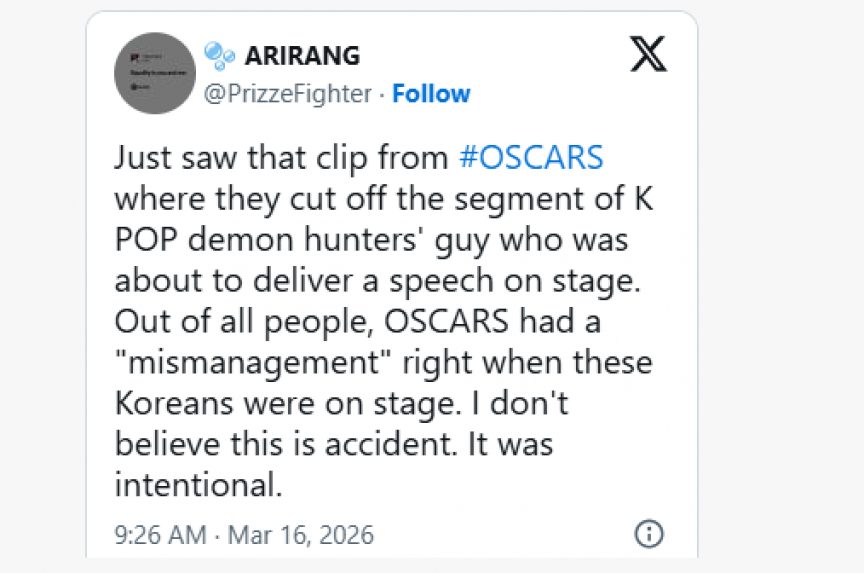 ރޭ ބޭއްވި މި އަހަރުގެ އޮސްކާ އެވޯޑް ހަފުލާގައި 'ކޭ-ޕޮޕް ޑީމަން ހަންޓާސް' ގެ ޓީމުން ޝުކުރު އަދާކުރުމަށް ދެއްކި ވާހަކަ މެދުކަނޑާލުމުން ސަޕޯޓަރުންގެ ނުރުހުން އަމާޒުވެއްޖެއެވެ.