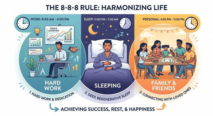 "ތިން އަށެއްގެ އުސޫލު" އަކީ ހަމައެކަނި ތާވަލެއް ނޫނެވެ. މިއީ ދިރިއުޅުމުގެ ފަލްސަފާއެކެވެ. ދިރިއުޅުމުގެ ހުރިހާ ދާއިރާއަކުން ހަމަހަމަކަން (ބެލެންސް) ގެނައުމެވެ. ހަނދާން ބަހައްޓާށެވެ؛ ކާމިޔާބު މީހަކީ ހަމައެކަނި ގިނަ ފައިސާ ހޯދާ މީހާއެއް ނޫނެވެ. އެއީ އުފާވެރި އާއިލާއެއް އޮތް، ދުޅަހެޔޮ ސިއްހަތެއްގައި ހުރި، އަދި އަމިއްލަ ނަފްސަށް ވަގުތު ހޯދާ މީހާއެވެ.