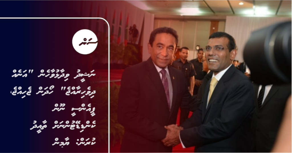 ކުރީގެ ރައީސް މުހައްމަދު ނަޝީދު ވިދާޅުވާހެން "އަނެއް ދިވެހިރާއްޖެ" ހޯދަން މިހާރު ޖެހިއްޖެ ކަމަށާއި، ކުރިއަށް އޮތް ލޯކަލް ކައުންސިލް އިންތިޚާބުގައި ސަރުކާރު މައި ޕާޓީ ޕީއެންސީ ނޫން އެހެން ހުރިހާ ކެންޑިޑޭޓުންނަށް ތާއީދުކުރައްވާ ކަމަށް ކުރީގެ ރައީސް އަބްދުﷲ ޔާމީން އަބްދުލްގައްޔޫމް މިރޭ ވިދާޅުވެއްޖެއެވެ.