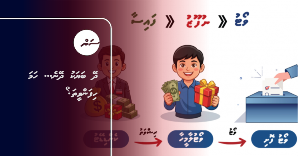 މިއީ މޫސުމީ ވާހަކައަކީ ބާވައެވެ؟ ވަރަށް ގިނައިން އިވޭ އަޑުތަކެކެވެ. ވަރަށް ގިނަ ޤައުމުތަކުގައި ވެސް ވަރަށް ހަރުއަޑުން ދައްކާ ވާހަކައެކެވެ. އިންތިޚާބުގެ ދުވަސްވަރު ކެންޑިޑޭޓުން ނުވަތަ އެމީހުންގެ ފަރާތުން ފައިސާ ނުވަތަ ހަދިޔާ ދިނުމާއި، ވޯޓުލާ މީހުން އެފަދަ ތަކެތި ހިފުމަކީ، ހިނގަމުންދާ ޢަމަލުތަކެކެވެ. މިއީ ރާއްޖޭގައި ވެސް ހިނގާ ކަންކަމެވެ. އެހެންނަމަވެސް މިއީ ދިވެހިރާއްޖޭގެ ޤާނޫނުތަކުގެ ދަށުން ނުހަނު ބޮޑެތި އަދަބުތައް ކަނޑައެޅިފައިވާ ޖިނާއީ ކުށްތަކެކެވެ. މިކަމާ ގުޅޭގޮތުން ކުރުކޮށް އަލިއަޅުވާލަމެވެ.