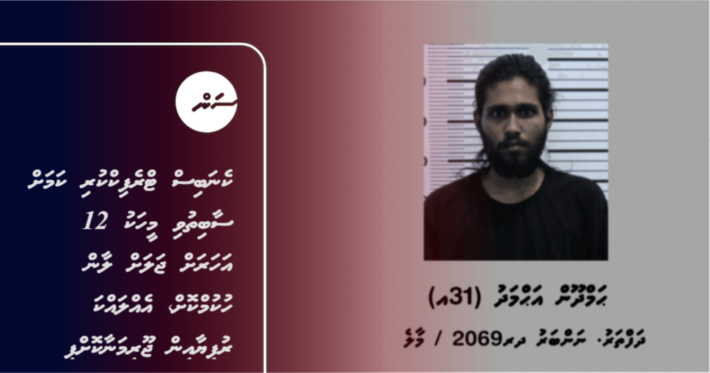 ފުލުހުން ބުނީ، ކެނަބިސް ޓްރެފިކްކުރި ކަމުގެ ކުށް ސާބިތުވެ، 12 އަހަރަށް ޖަލަށް ލާން ހުކުމްކުރީ ދަފްތަރު ނަންބަރު ދރ 2069 / މާލެ، ޙަމްދޫން އަޙްމަދު (31އ) ގެ މައްޗަށް ކަމަށެވެ.