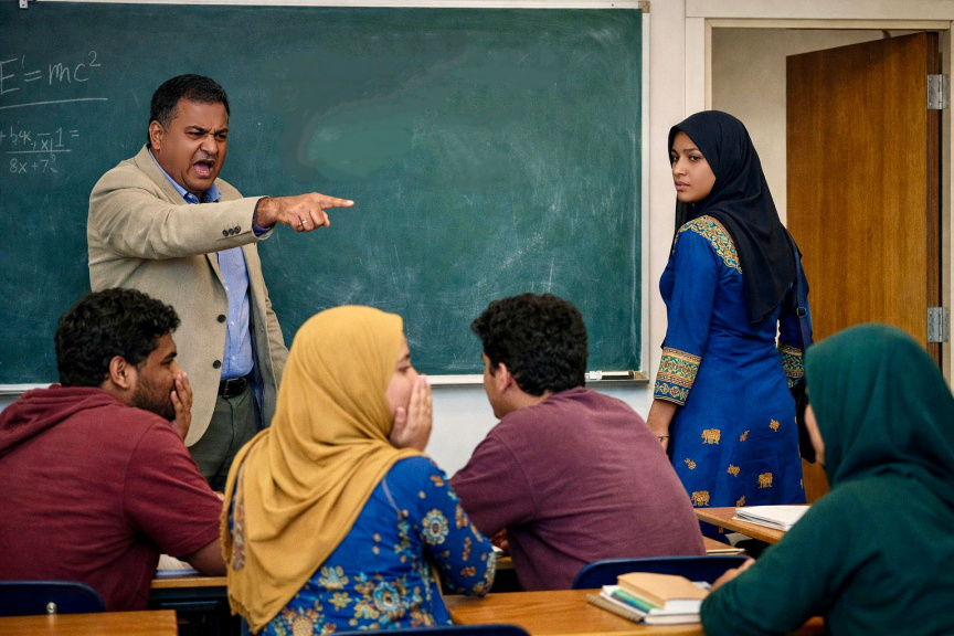 ކްލާސްރޫމްގެ ތެރޭގައި އޮތީ ހިމޭންކަމެކެވެ. އިވެމުންދިޔައީ ހަމައެކަނި ލެކްޗަރާ ކްލާސްތެރޭގައި ހިނގަމުންދިޔަ ފިޔަވަޅުތަކުގެ އަޑެވެ. އޭގެ ކުޑަވަގުތުކޮޅެއް ކުރިން، އޭނާ ވަނީ އެއްވެސް ކުށެއްނެތް ދަރިވަރަކަށް އިނގިލި ދިއްކޮށް، ކްލާހުން ނުކުތުމަށް އަމުރުކޮށްފައެވެ. އެއްވެސް ސަބަބެއް ނެތެވެ. އެއްވެސް ކުށެއް ނުކުރެއެވެ. ހަމައެކަނި ފިނި ބަހަކުން ބުނެލީ "ބޭރަށްދާށެވެ."