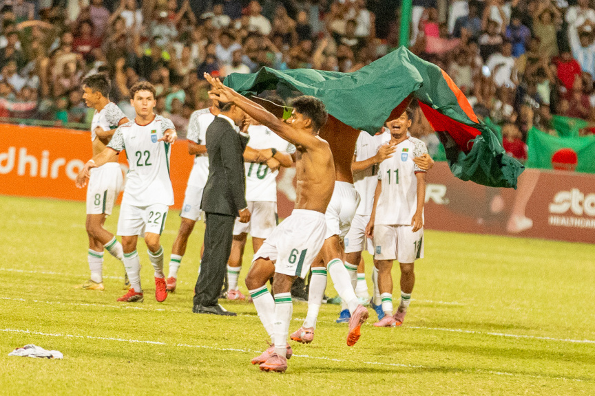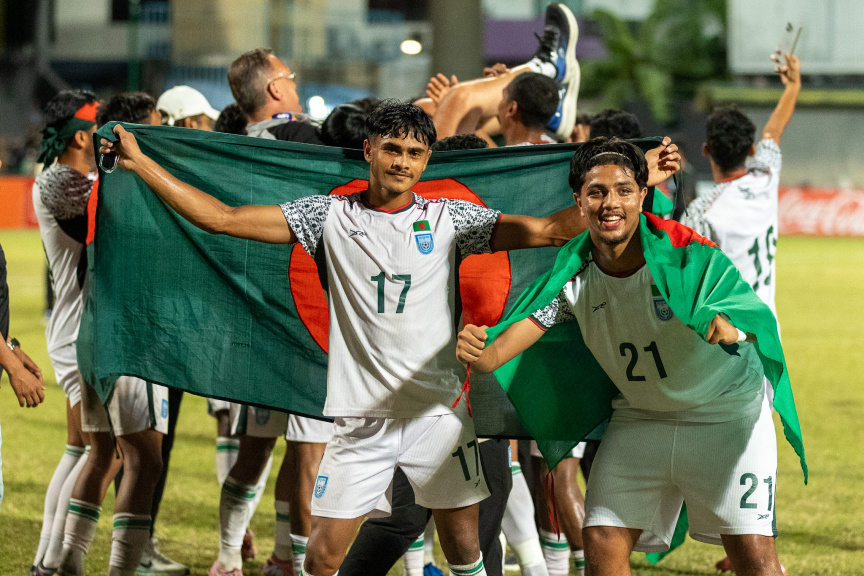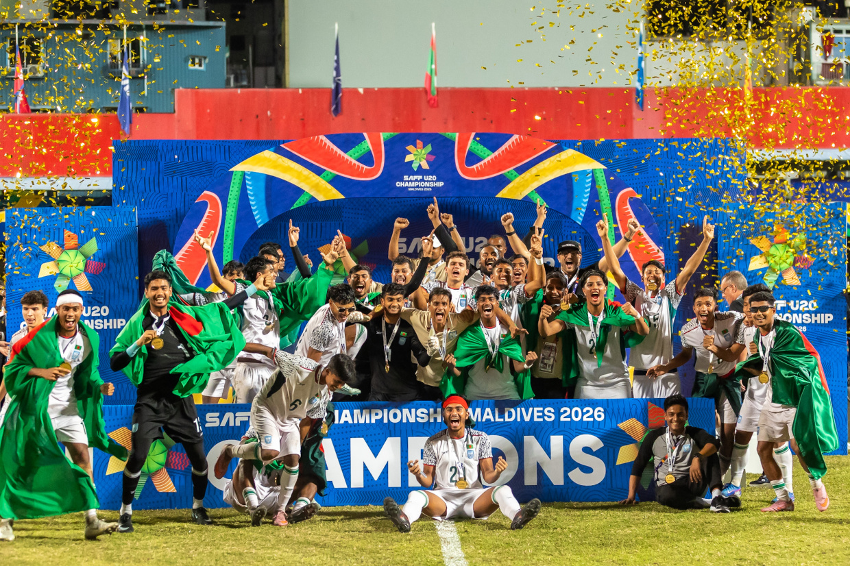 ސާފް 20 އަހަރުންދަށުގެ ޗެމްޕިއަންކަން ހޯދި ބަންގްލަދޭޝް ޓީމު އުފާފާޅުކުރަނީ-- ސަން ފޮޓޯ: ޝާތިއު ޢަބްދުﷲ
