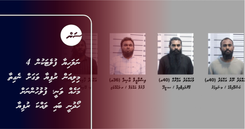 ފުލުހުން ބުނީ އެ މައްސަލައިގައި ފަސް މީހަކަށް ތުހުމަތު ކުރެވޭ ކަމަށެވެ. އޭގެ ތެރެއިން ހަތަރު މީހަކު ހައްޔަރުކޮށް، މިވަގުތު ބަންދުގައި ތިބިއިރު، އެކަކު ހޯދުމުގެ މަސައްކަތް ކުރަމުން އަންނަ ކަމަށް ފުލުހުން ބުންޏެވެ.