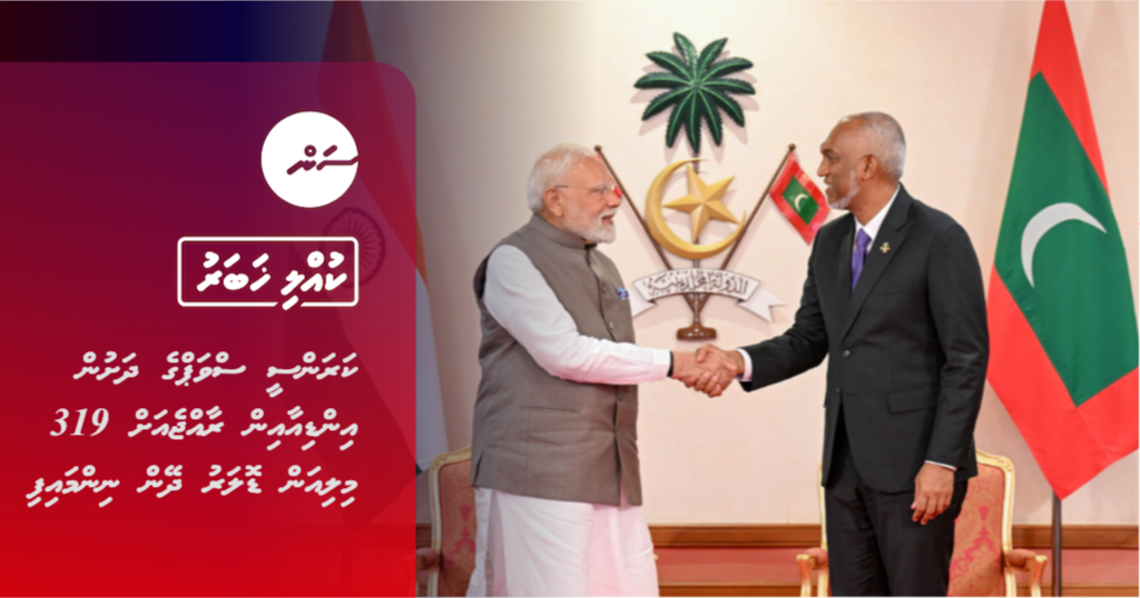 ދިވެހި ސަރުކާރަށް ންޑިއާ ސަރުކާރުން ފޯރުކޮށްދެމުންދާ އިޤްތިޞާދީ އަދި މާލީ އެހީތެރިކަމުގެ ދަށުން، ރާއްޖެއަށް 319 މިލިއަން އެމެރިކާ ޑޮލަރު (30 ބިލިއަން އިންޑިއަން ރޫޕީސް) ދޫކުރުމަށް އިންޑިއާ ސަރުކާރުން ނިންމައިފިއެވެ.