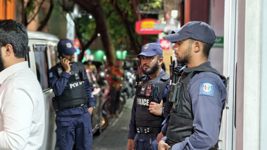 އަދަދު ނޫހުގެ އޮފީސް ކުރިމަތީގައި ފުލުހުންތަކެއް ހަރަކާތްތެރިވަނީ --- ސަން ފޮޓޯ/ އަހުމަދު އިޔާދު