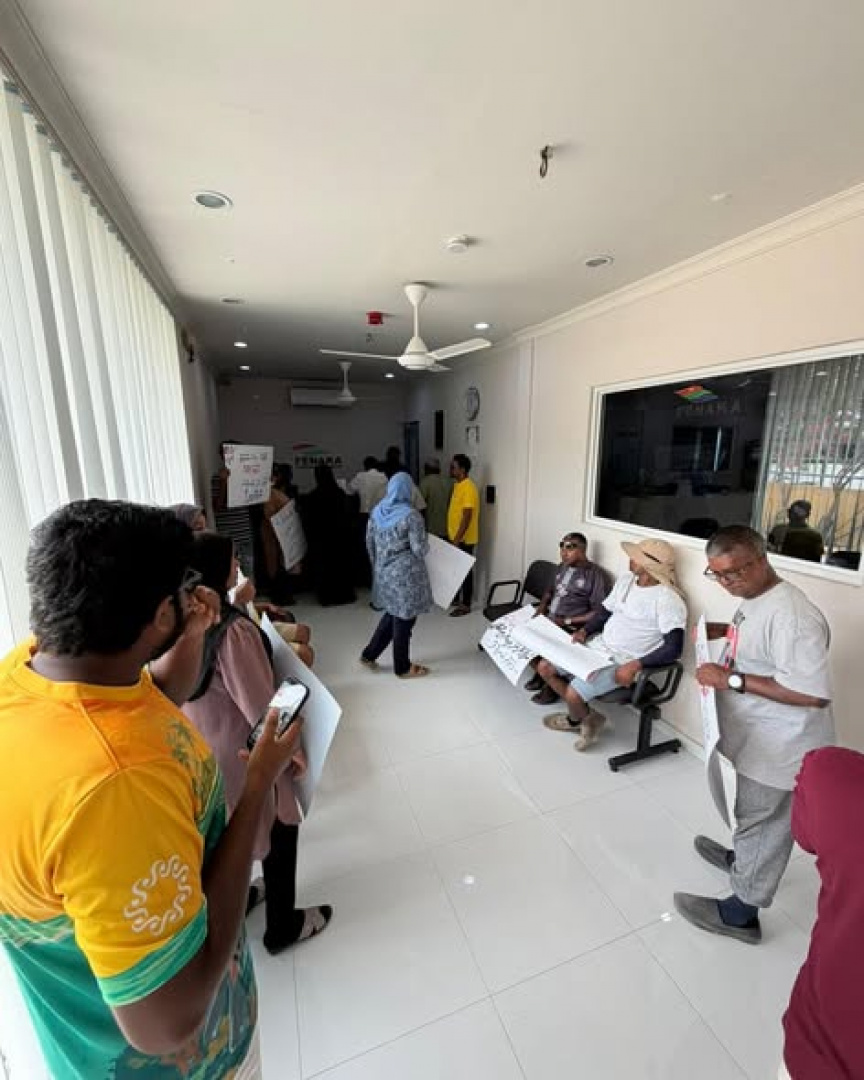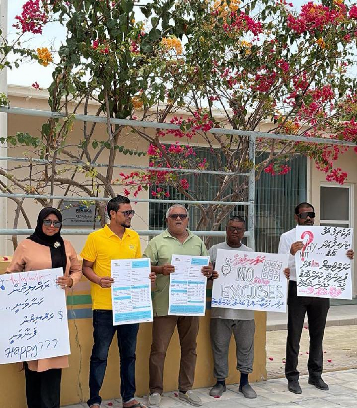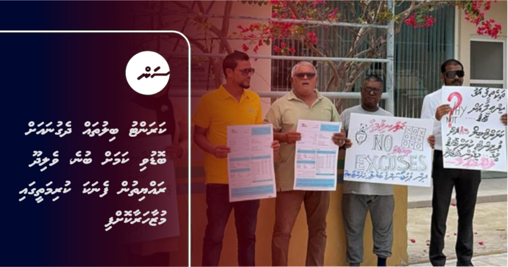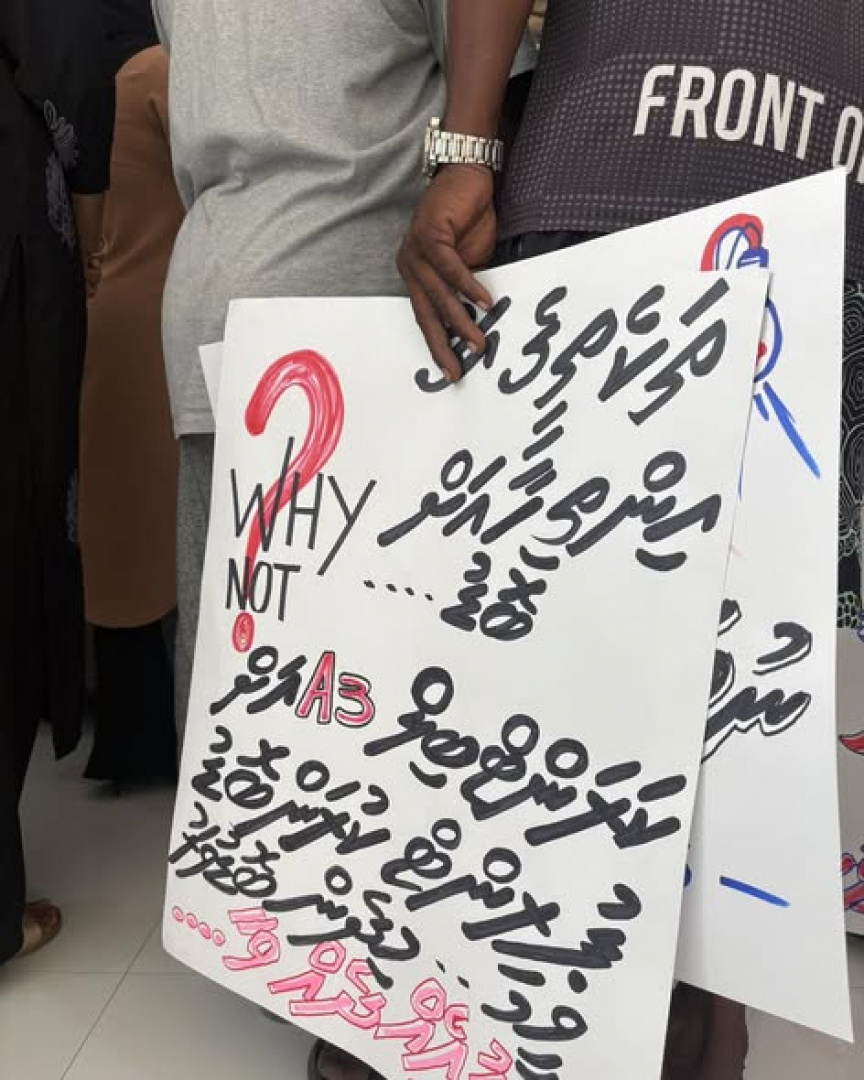 ވެލިދޫ ފެނަކަ އޮފީސް ކުރިމަތީގައި އާންމުން ކުރި މުޒާހަރާގައި ވަނީ އެކި ޝުއޫރުތައް ލިޔެފައިވާ ޕޯސްޓަރުތައް ބޭނުންކޮށްފައެވެ.