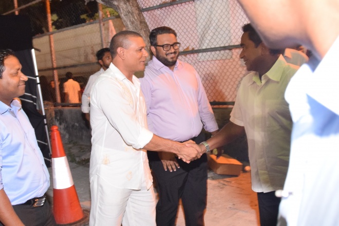 މިނިވަން 50ގެ އުފަލުގައި ބަކަރި ކަތިލުމުގެ ކުރިން، ޖަމާއަތުގައި އިޝާނަމާދު ކުރުމަށް ރައީސް ޔާމިން ވަޑައިގަތުމުން އެމަނިކުފާނަށް އެމްޑީއޭގެ ލީޑަރު ސިޔާމް މަރުހަބާ ވިދާޅުވަނީ-- ސަން ފޮޓޯ/ ފަޔާޒު މޫސާ