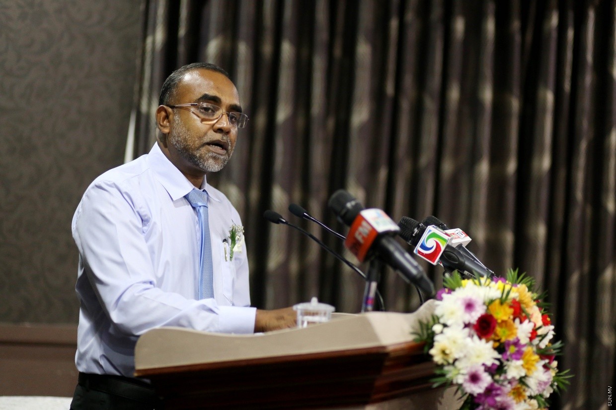 ކްރިމިނަލް ކޯޓުގެ އަހަރީ ދުވަސް ފާހަގަކުރުމުގެ ގޮތުން ނަސަންދުރަ ޕެލަސް ހޮޓަލުގައި ބޭއްވި ހަފްލާގައި އެ ކޯޓުގެ ގާޒީ ސުޖާއު އުސްމާން (މެދު) -- ސަން ފޮޓޯ/ފަޔާޒު މޫސާ