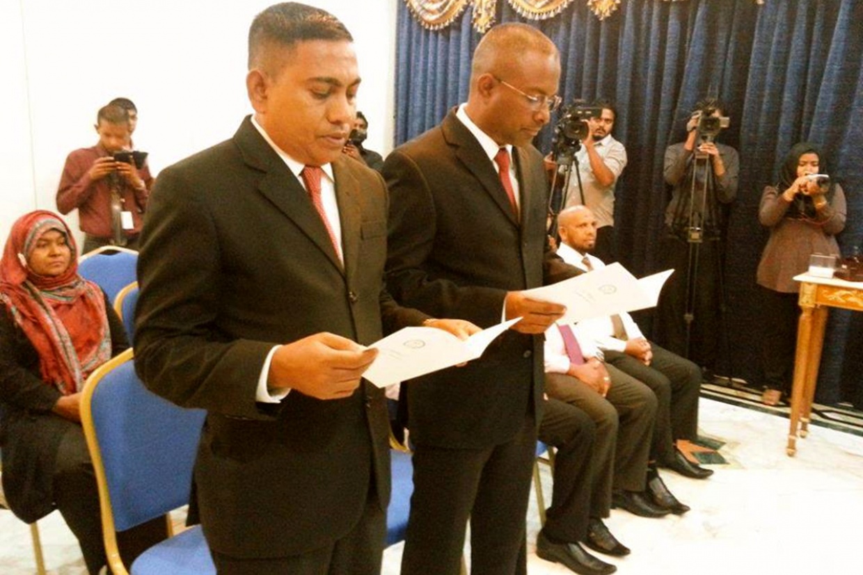ސުޕްރީމް ކޯޓުގައި މިއަދު ބޭއްވި ރަސްމިއްޔާތެއްގައި އެ ދެ ބޭފުޅުންނަށް ހައިކޯޓުގެ ފަނޑިޔާރު ކަމުގެ ހުވާ ލައިދެއްވީ ސުޕްރީމް ކޯޓުގެ ފަނޑިޔާރު އާދަމް މުހައްމަދު އަބްދުﷲ އެވެ.