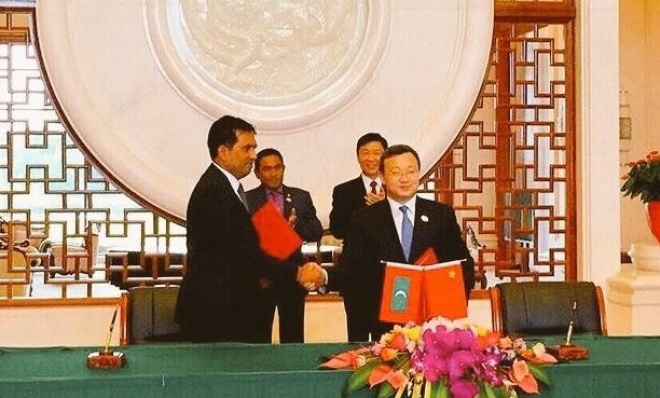 ޗައިނާ އާއި ރާއްޖެ އާއި ދެ ގައުމުގެ ދެމެދުގައި ހިލޭ އެހީތެރިކަން ފޯރުކޮށް ދިނުމުގެ އެއްބަސްވުމުގައި ސޮއި ކުރި ރަސްމިއްޔާތުގެ ތެރެއިން-- ފޮޓޯ/ އިބްރާހިމް މުއާޒު އަލީ