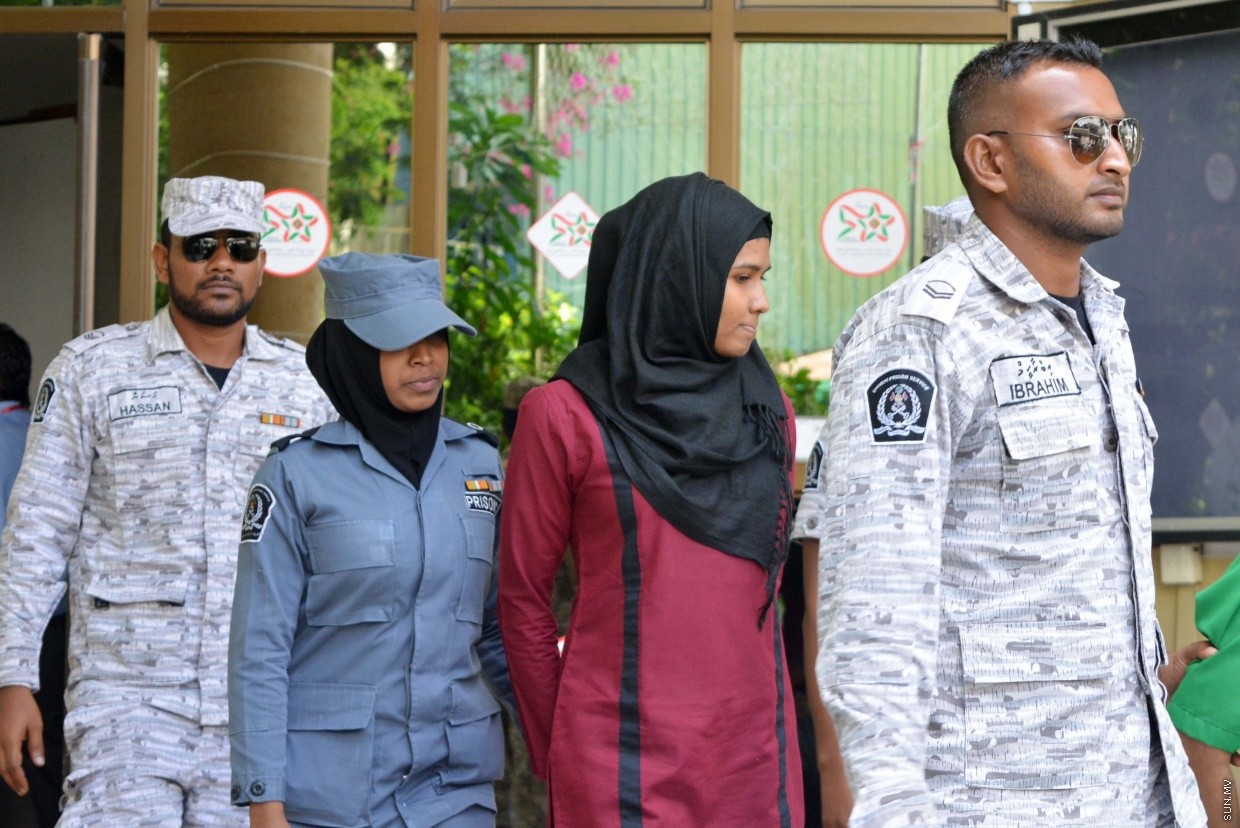 އޯގަސްޓް 3، 2015: މޭޑޭ މުޒާހަރާގައި ފުލުހަކަށް ހަމަލާދިން ކަމަށް ތުހުމަތު ކުރެވޭ މީހުން ޝަރިއަތައް ހާޒިރުކުރުން -- ސަން ފޮޓޯ/ ފަޔާޒު މޫސާ