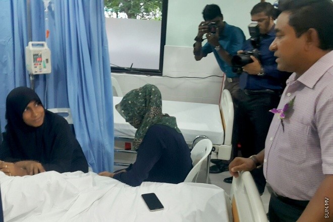 ވިލިމާލޭ ހޮސްޕިޓަލް ޓާޝަރީ ހޮސްޕިޓަލެއްގެ ގޮތުގައި ހުޅުވުމަށް ރައީސް ޔާމީން އެ ހޮސްޕިޓަލްގައި ތިބި ބަލިމީހުންނަށް ޒިޔާރަތްކުރައްވަނީ -- ސަން ފޮޓޯ: އަހްމަދު ޝަރުވާން