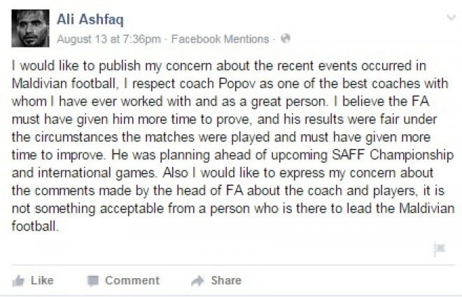 މިމަހު 13 ވަނަ ދުވަހު ކޯޗް ދިފާއުކޮށް ދގަނޑޭ އޭނާގެ އެފްބީގައި ކޮށްފައިވާ ޕޯސްޓް --- ފޮޓޯ/ އެފްބީ