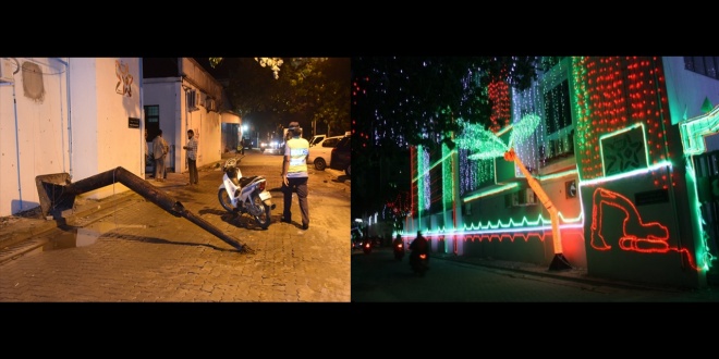 ހޮޅިދަނޑީގެ އެހާރާއި މިހާރު: މިނިވަން ފަންސާހަށް މާލެ ދިއްލިއިރު ބޭނުންކުރި ހޮޅިދަނޑީގައި ބޮކިފަތިލާފައި (ކ. ފޮޓޯ: ސީއެންއެމް) އަދި ރޭ އެކްސިޑެންޓު ހިނގުމަށްފަހު މަގުމައްޗަށް އެ ހޮޅިދަނޑި ވެއްޓިފައި ---- ސަން ފޮޓޯ