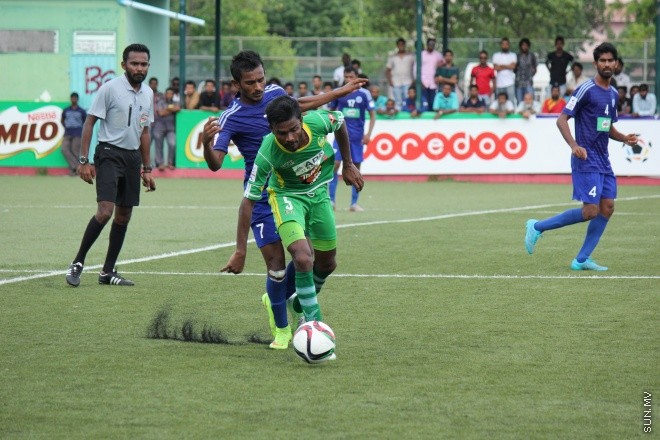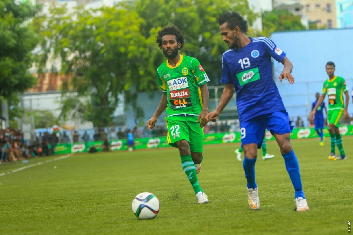 އުރީދޫ ދިވެހި ޕްރިމިއާ ލީގްގައި މިއަދު ހަވީރު ނިއުއާއި މާޒިޔާ ބައްދަލު ކުރި މެޗްގައި ނިއުގެ އަލީ ފާސިރު (ސެންޓޭ) މާޒިޔާގެ ކުޅުންތެރިން އަތުން ބޯޅަ ހޯދަން މަސައްކަތް ކުރަނީ --- ފޮޓޯ: ހަމްދޫން ރިޔާޒް