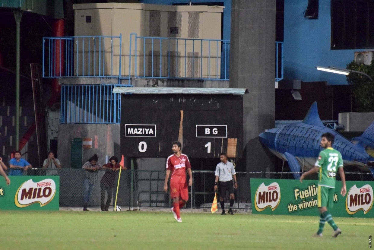 އޭގެ ފަސް މިނެޓް ފަހުން އަނެއްކާވެސް މާޒިޔާއަށް ވަނީ ގޯލެއް ޖަހާނެ ރަނގަޅު ފުރުސަތެއް ލިބިފައެވެ. ހަސަން ޝިފާޒް ހުރަސް ކޮށްދިން ބޯޅަ ބީޖީއޭރިއާ ތެރެއިން އެ ޓީމްގެ ކުޅުންތެރިން ދިފާއުކުރި ބޯޅަ ލިބުނީ ހުސްކޮށް ހުރި މާޒިޔާގެ ކެޕްޓަން އަސަދުއްﷲ އަބްދުއްﷲ އަށެވެ. ނަމަވެސް އެބޯޅަވެސް ބީޖީގެ ޑިފެންޑަރުން ވަނީ ކްލިއަރކޮށްލާފައެވެ.