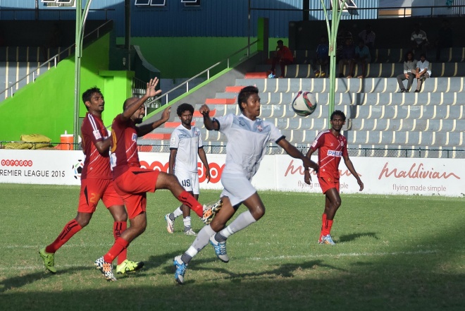 އުރީދޫ ދިވެހި ޕްރިމިއާ ލީގުގައި ބީޖީ ސްޕޯޓްސްއާ ދެކޮޅަށް ޓީސީ ބައްދަލު ކުރި މެޗުގެ ތެރެއިން-- ސަން ފޮޓޯ/ ފަޔާޒު މޫސާ