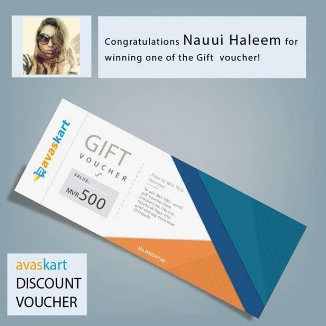 ފޭސްބުކްގައި އަވަސްކާޓުން ކުރިޔަށް ގެންދާ އެ ޕްރޮމޯޝަނުގެ ފުރަތަމަ ހަފްތާގެ ނަސީބުވެރިއަކަށް ހޮވިގެން 500 ރުފިޔާގެ ޑިސްކައުންޓް ވައުޗަރު ލިބިފައި ވަނީ ނައު ހަލީމްގެ ނަމުގައި ފޭސްބުކް މެދުވެރިކޮށް ޕްރޮމޯޝަނުގައި ބައިވެރިވި ފަރާތަށެވެ.