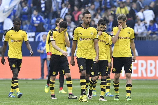 ޖަރުމަން ބުންޑަސްލީގައި ޝާލްކޭއާ ދެކޮޅަށް ކުޅުނު މެޗަށްފަހު ބޮރޫޝިއާ ޑޯޓްމަންޑްގެ ކުޅުންތެރިން ދަނޑުން ފައިބަނީ: އެ މެޗު ނިމިގެންދިޔައީ 2-2 ލަނޑުން ދެ ޓީމު އެއްވަރުވެގެން -- ފޮޓޯ: އޭޕީ