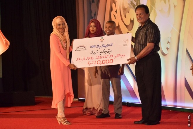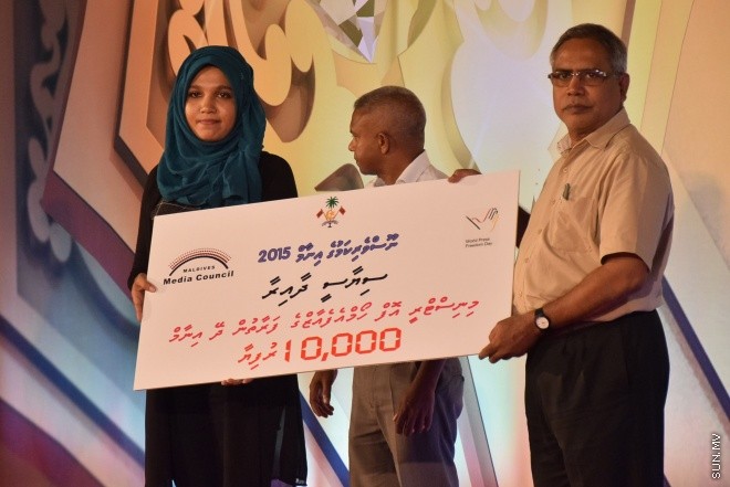 މޯލްޑިވްސް މީޑިޔާ ކައުންސިލުން ދޭ ނޫސްވެރިކަމުގެ އިނާމު 2015 ދިނުމުގެ ރަސްމިއްޔާތުގެ ތެރެއިން: އެންމެ އުންމީދީ ނޫސްވެރިޔަކަށް ހޮވުނު ސާއިލް -- ސަން ފޮޓޯ/ މުހަންމަދު އަފްރާހް