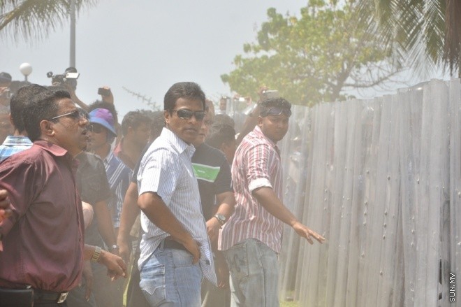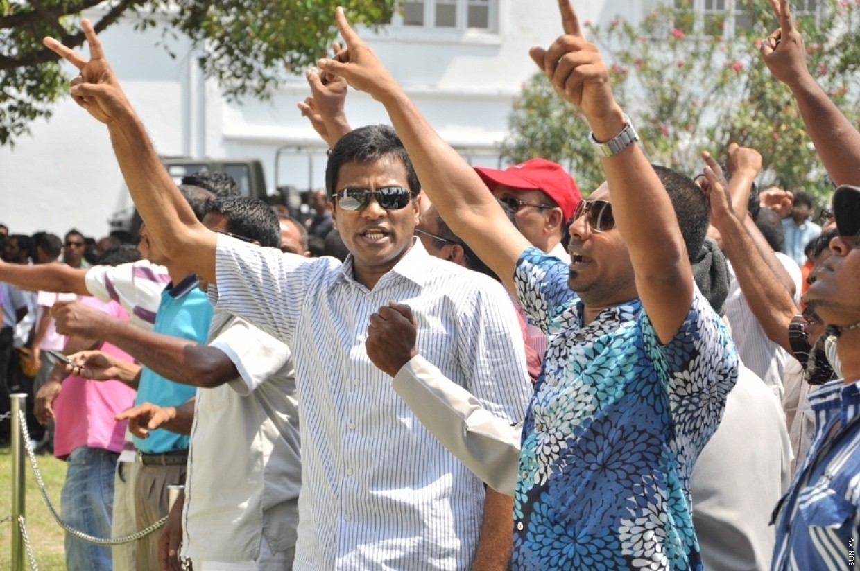 2011ގައި ނަޝީދުގެ ސަރުކާރާ ދެކޮޅަށް އިދިކޮޅު ފަރާތްތަކުން ޖުމްހޫރީ މައިދާނަށް އެއްވެ ކުރި މުޒާހަރާއެއްގެ އިސް ސަފުގައި މިހާރުގެ ހޯމް މިނިސްޓަރު އުމަރު ނަސީރު-- ސަން ފޮޓޯ/ އަލީ ނަސީރު