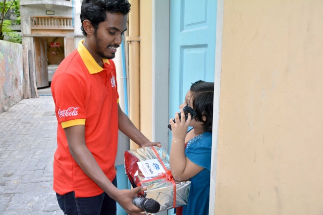 މިދިޔަ އަހަރުގެ ފިނިއަށި ޕްރޮގްރާމުގައި ހަދިޔާ ލިބުނު ކުޑަކުއްޖަކަށް ޕްރޮގްރާމްގެ އިނާމު ޓީމު އެގެއަށް ގޮސް އިނާމު ހަވާލުކުރަނީ --- ސަން ފައިލް ފޮޓޯ