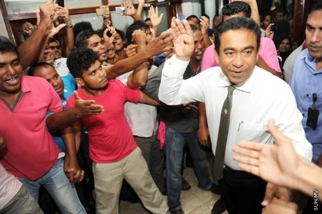 ރިޔާސީ އިންތިހާބު ކާމިޔާބު ކުރެއްވި ދުވަހު ރައީސް ޔާމީން، އެމަނިކުފާނުގެ ސަޕޯޓަރުންނާ އެކު: ޕާޓީގެ ކައުންސިލްގެ މެޖޯރިޓީ ރައީސް ޔާމީނަށް ކޮންޓްރޯލް ކުރައްވާ-- ސަން ފޮޓޯ/ ފަޔާޒު މޫސާ