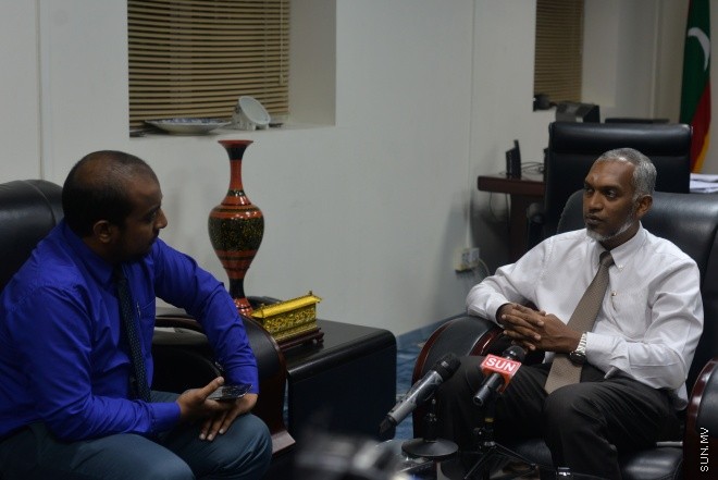 ހައުސިން މިނިސްޓަރ ޑރ. މުއިއްޒު ސަންއަށް އިންޓަވިއޫދެއްވަނީ-- ސަން ފައިލް ފޮޓޯ