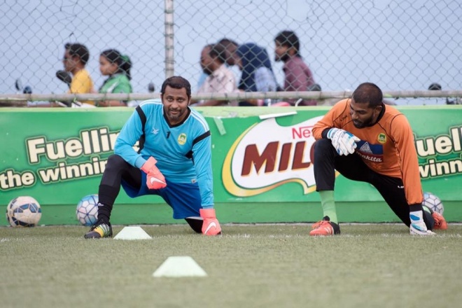 މަރޭ ކުރިމަތިކުރުވި ޗެލެންޖް ފުރިހަމަ ކުރުމަށް މާޒިޔާގެ ކީޕަރު އިމްރާން (ކ) އާއެކު އޭޑީކޭ ހޮސްޕިޓަލްގެ އެމްޑީ އަފްއާލް (ވ) މާޒިޔާގެ ފަރިތަކުރުންތަކުގައި ބައިވެރިވަނީ --- ފޮޓޯ: ފާއިދު