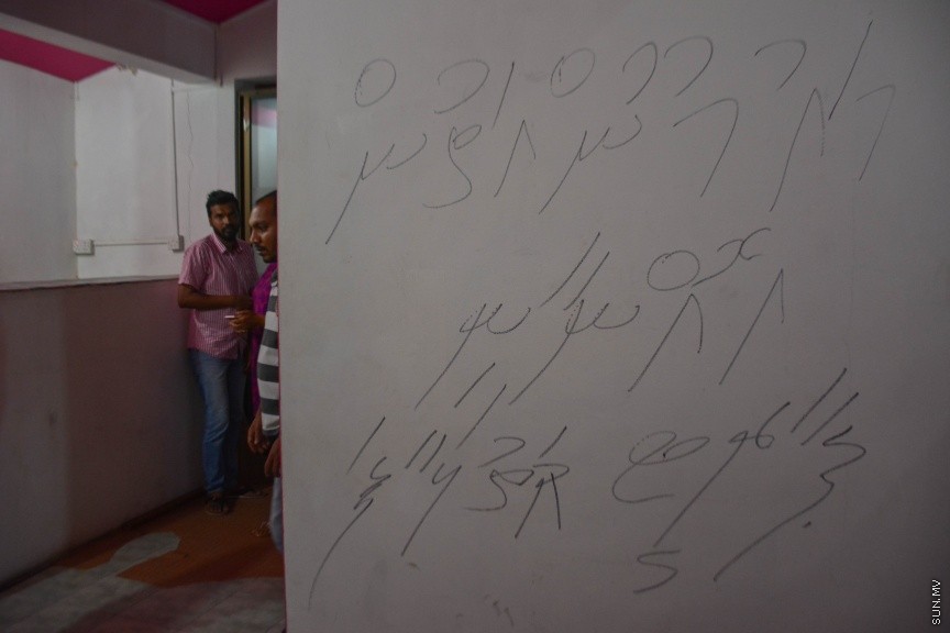 ނޮވެމްބަރ 1، 2016: ޕީޕީއެމްގެ އޮފީސް ހިންގި އިމާރާތް ކަމަށްވާ ހ. ތެމާގެ އެތެރެ މިއަދު ނޫސްވެރިންނަށް ދައްކާލުން: ރައީސް މައުމޫނަށް ނިސްބަތްކޮށް ހަޑިހުތުރުބަހުން އޮފީސް ތެރޭގެ ފާރުތަކުގައި އެކި އިބާރާތުން ލިޔުންތައް ވަނީ ލިޔެފައި -- ސަން ފޮޓޯ/ ފަޔާޒު މޫސާ
