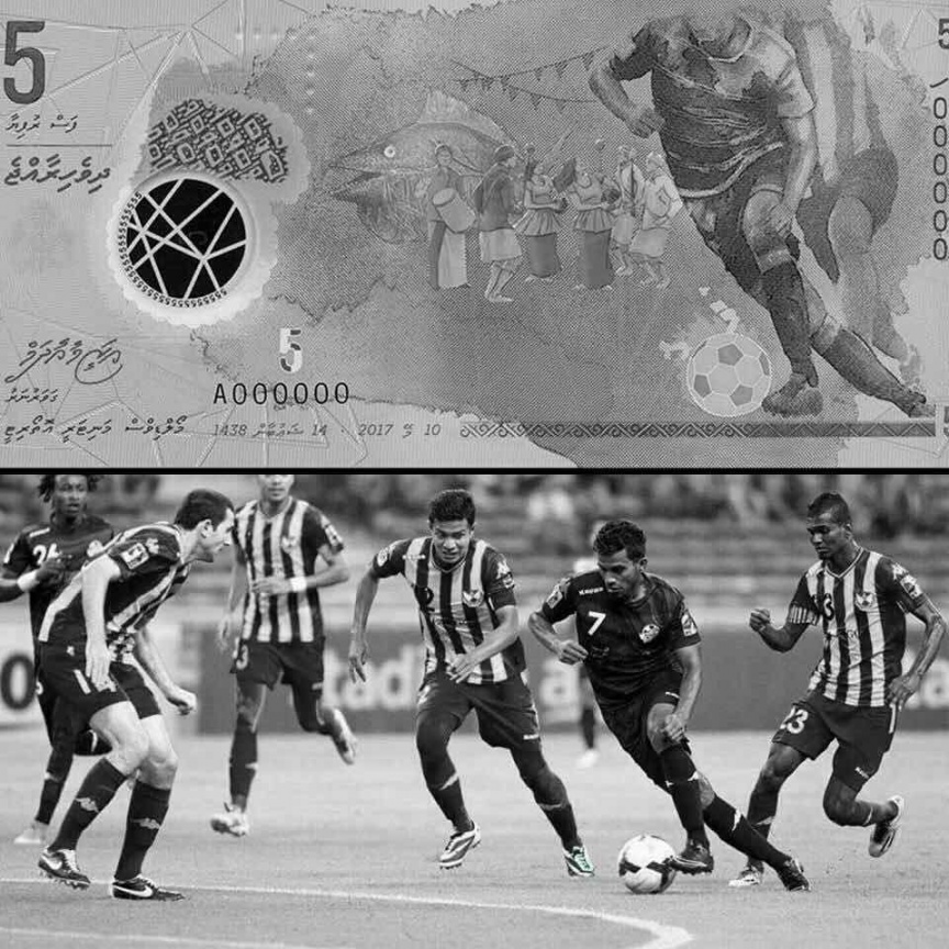 އަލަށް ތައާރަފްކުރި ފަސް ރުފިޔާގެ ނޫޓުގެ މޫނުމަތީގައި ކުރަހާފައިވާ ތަސްވީރާއި ރާއްޖޭގެ ގައުމީ ޓީމުގެ ކުރީގެ ކެޕްޓަން އަލީ އަޝްފާގު މެޗެއްގައި ކުޅެނިކޮށް ނަގާފައިވާ ފޮޓޯއެއް --