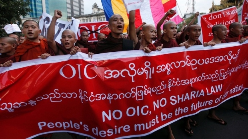 އޯގަނައިޒޭޝަން ފޯ އިސްލާމިކް ކައުންސިލް (އޯއައިސީ) އިން މިޔަންމާ އަށް ކުރި ޒިޔާރަތާ ދެކޮޅަށް ބުޑިސްޓުން މުޒާހަރަާ ކުރަނީ.