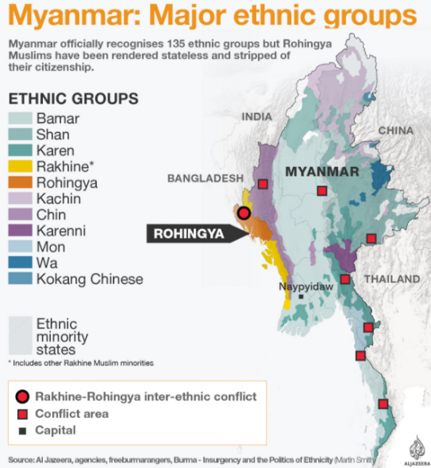 މިޔަންމާގައި ދިރިއުޅޭ މުހިއްމު ނަސްލުތައް. ރޮހިންޔާ އަކީ މިޔަންމާއަށް ނިސްބަތްވާ ބައެއް ކަމަށް އެގައުމުގެ ސަރުކާރުން ގަބޫލެއް ނުކުރޭ