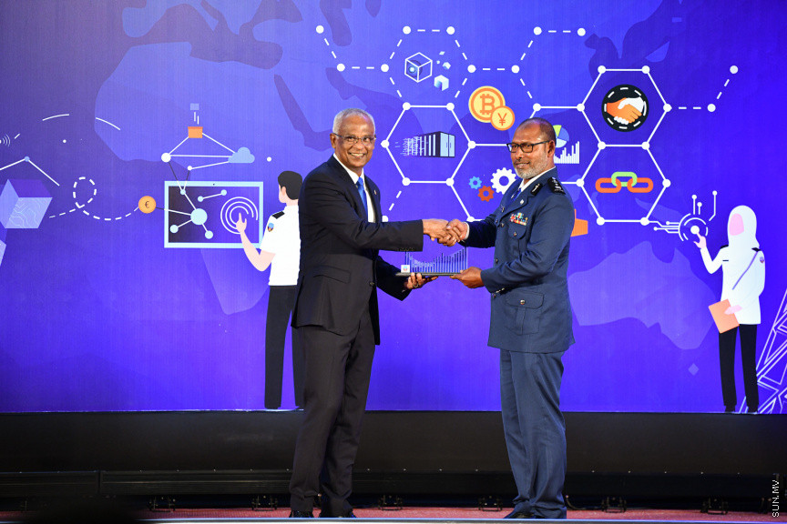 މޯލްޑިވްސް ކަސްޓަމް ސާރވިސްގެ 132 ވަނަ އަހަރީ ހަފްލާގެ ތެރެއިން ރައީސް އިބްރާހީމް މުޙައްމަދު ޞާލިޙު ވާހަކަފުޅުދައްކަވަނީ -- ސަން ފޮޓޯ/ މުހައްމަދު ހައްޔާން