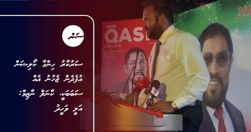 ގާސިމް ކެމްޕެއިން ލޯންޗްކުުރުމަށް ޖުމްހޫރީ ޕާޓީން ރޭ މާމިގިލީގައި ބޭއްވި ޖަލްސާގައި އަލީ ވަހީދު ވާހަކަ ދައްކަވަނީ: އަލީ ވަހީދު ވިދާޅުވީ، ކޯލިޝަން އުފެދެން ޖެހުނު އެއް ސަބަބަކީ ކާނަލް ނާޒިމް ކަމަށް -- ޓްވީޓާ ފޮޓޯ/ ޖުމްހޫރީ ޕާޓީ